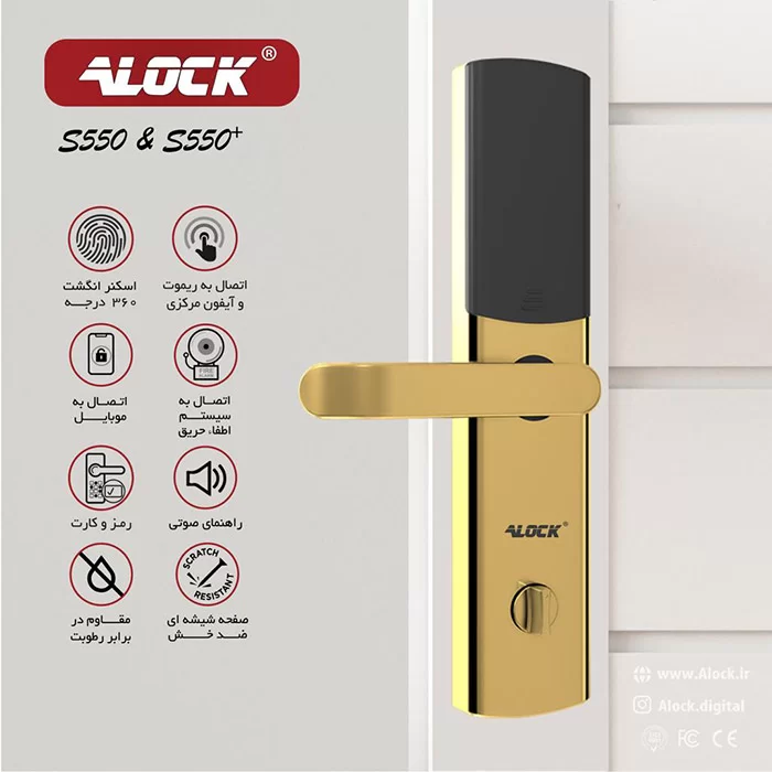 قفل دیجیتال S550 بر اساس تجربه موفق قفل هوشمند اثر انگشتی N120 و مطابق با آناتومی بدن و دست طراحی و تولید شده است. این طراحی خاص سبب محبوبیت این مدل از محصول در مقایسه با قفل های دیجیتالی شده است که از نوع اسکنرهای لوکالیزه استفاده می کنند. نیاز کشور و پروژه های مسکونی و اداری به امنیت با تکنولوژی های به روز سبب طراحی های خاص در صنعت قفل های الکترونیکی ALOCK شده است. یکی از ویژگی های دستگیره اثرانگشتی S550 طراحی زیبا و ظریف با نوع اسکنر بیومتریک ارگونومیک می باشد. صفحه لمسی و نمایشگر این دستگیره به شیشه Tempered Glass مجهز شده که این محصول را در برابر ضربه و خش پذیری بسیار مقاوم می نماید. این قفل اثر انگشتی با قطعات برد ساخت ژاپن طراحی و تولید شده که سبب افزایش طول عمر این محصول در مقایسه با دیگر محصولات در بازار شده است. بدنه این دستگیره اثر انگشتی S550، از قطعات کاملا فلزی ساخته شده که استقامت آن را در برابر برندهای دیگر بازار بیشتر کرده است. قفل دیجیتال اثر انگشتی S550 با ورژن 2022 دارای قابلیت ذخیره 300 نفر کاربر مختلف را دارد (ترکیبی از اثرانگشت – رمز و کارت) گزارش ورود و خروج افراد با ذکر تاریخ و ساعت دقیق تردد، تائید ورود دو مرحله ای، مد عبور و تردد آزاد برای مواقع پر تردد مانند میهمانی ها و … یکی دیگر از امکانات این محصول می باشند .