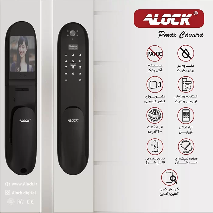 نرم افزار ارتباط آنلاین این محصول نرم افزار بسیار محبوب می باشد. تخصصی Xhome می باشد که به کاربران امکان مشاهده تصاویر افراد را بر روی موبایل و کنترل حرفه ای محصول را می دهد. دستگیره اثر انگشتی Camera Pmax دارای بدنه بسیار قدرتمند و موتور بزرگ طرح Zanetti ایتالیا می باشد. صفحه لمسی و نمایشگر این دستگیره به شیشه Tempered Glass مجهز شده که این محصول را در برابر ضربه و خش پذیری بسیار مقاوم می نماید. دستگیره های سری Pmax دارای قابلیت باز و بسته شدن اتوماتیک بوده و بدون نیاز به دستگیره؛ می توان آن را با تلفن همراه نیز ار هر کجای دنیا باز کرد. قفل بدنه این محصول از فولاد آلیاژی ضد زنگ و کاملا اتومات طراحی شده به گونه ای که پس از بسته شدن درب، زبانه های قفل بصورت اتومات و هوشمند بسته خواهند شد. البته قابلیت قفل کردن دستی نیز با لمس یک دکمه برای این محصول پیش بینی شده است. این دستگره دیجیتال دارای کلید لمسی زنگ بوده که برای اعلان حضور افراد مقابل درب می توان از آن استفاده کرد. دسیبل شنیداری این زنگ در بازه 50 بوده که خریداران را از استفاده از زنگ های جانبی بی نیاز می کند. نیاز کشور و پروژه های مسکونی و اداری به امنیت با تکنولوژی های به روز سبب طراحی های خاص در صنعت قفل های الکترونیکی ALOCK شده است. این قفل با قطعات برد ساخت ژاپن طراحی و تولید شده که سبب افزایش طول عمر این محصول در مقایسه با دیگر محصولات موجود در بازار شده است. بدنه قفل اثر انگشتی Camera Pmax، از قطعات کاملا فلزی ساخته شده که از استقامت بی نظیری برخوردار است.